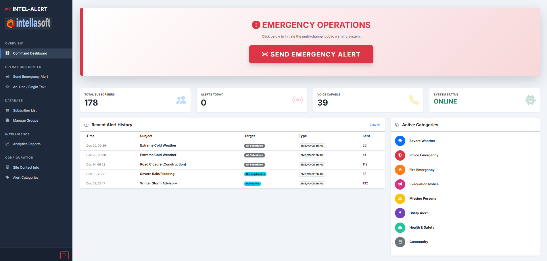 The INTEL-ALERT Command Dashboard is built for high-pressure situations. With a simplified "Emergency Operations" interface, administrators can launch a multi-channel alert in three clicks.