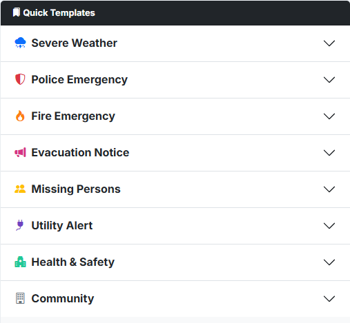 Panic leads to typos. INTEL-ALERT allows you to pre-configure message templates for common scenarios like Severe Weather, Evacuations, or Utility Outages.